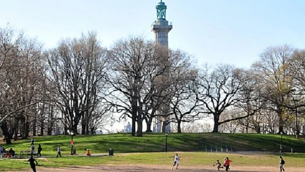 The monument stands as a grave to over 11,000 prisoners who died in British prison ships in nearby Wallabout Bay. The park itself, once called Washington Park, was established in 1848 and adopted its neighborhood nickname after colonial general Nathanael Greene in 1897. Greene supervised the construction of Fort Putnam, which survived the Battle of Brooklyn but was abandoned during General George Washington’s retreat across the East River. During World War II, more than 71,000 navy personnel and civilians worked at the navy yard and in 1944, the New York City Housing Authority built the Walt Whitman and Raymond V. Ingersoll Houses to house the wartime workforce.